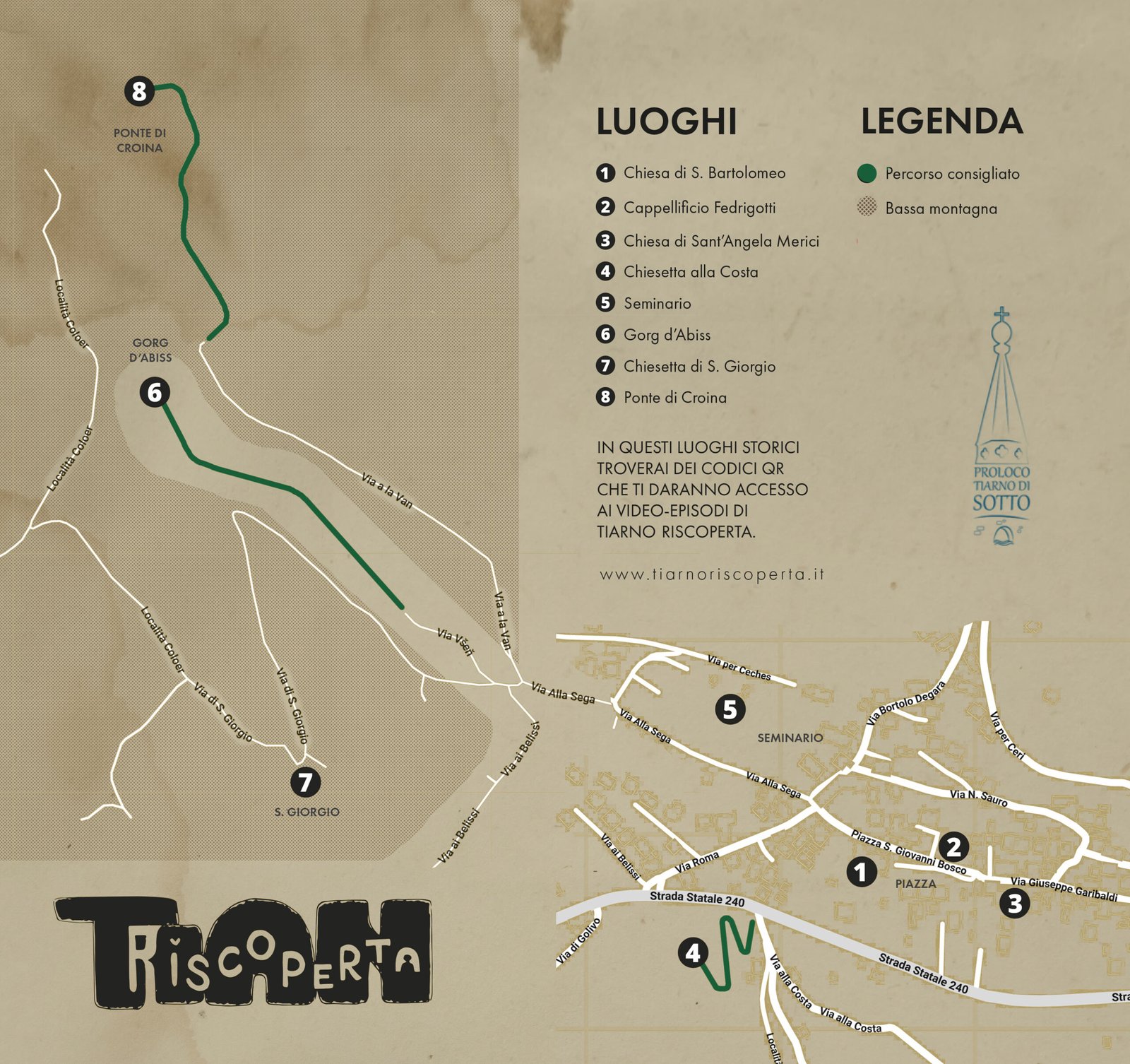 Tiarno Riscoperta è una “caccia al tesoro permanente” che, a partire dal cuore del paese di Tiarno di Sotto, piazza S.Giovanni Bosco, porta alla scoperta di otto “tesori”, nascosti dentro e fuori dal paese, permettendo al territorio di essere ri-vissuto e ri-scoperto!